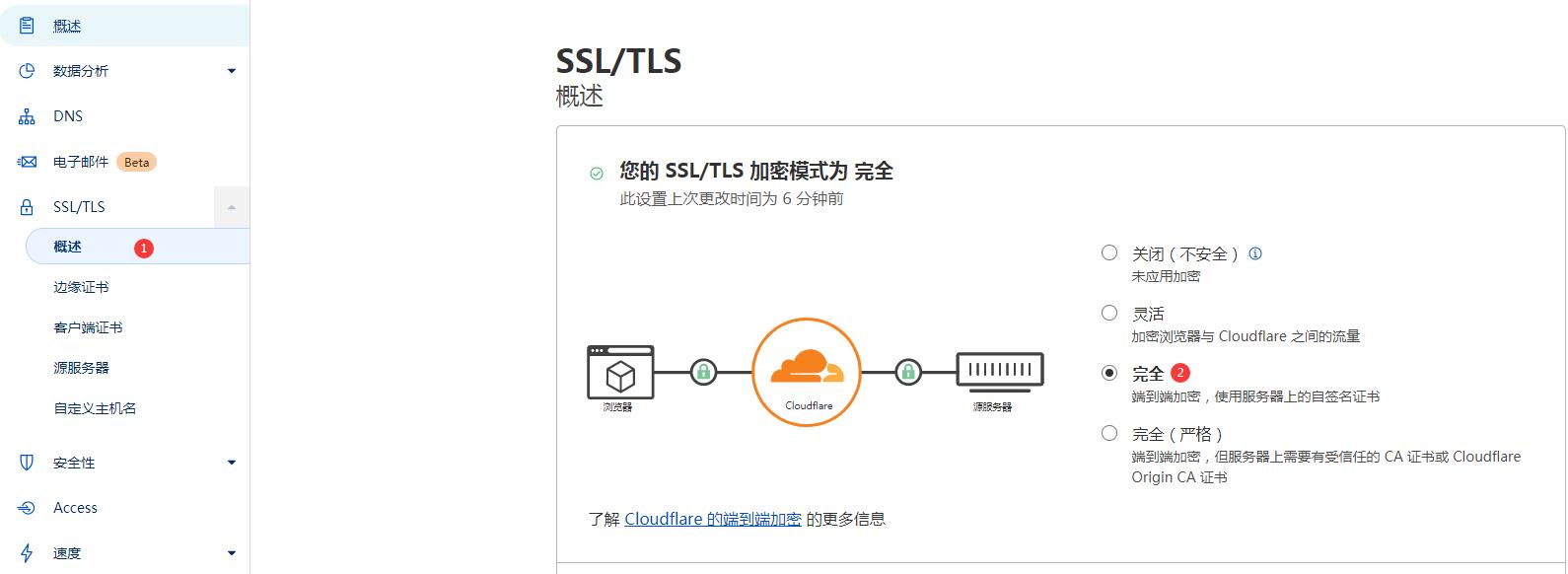 3、打开左侧菜单“SSL/TLS”- 把SSL/TLS 加密模式改为“安全”或者“完全”模式。