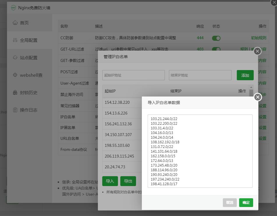 其实是宝塔自带的Nginx防火墙拦截了cloudflare CDN节点,我们只需要把cloudflare CDN节点添加到白名单中即可。