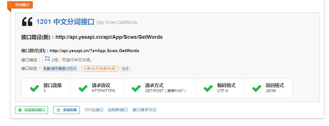 网上找了很久,免费的自动分词API接口很少,基本都要收费,找到的这款每月最高免费10万次,个人基本够用了。