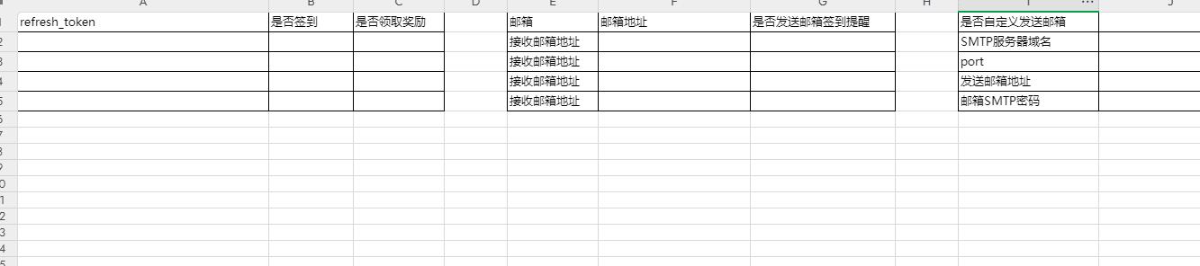 varmyDate=newDate();//创建一个表示当前时间的Date对象vardata_time=myDate.toLocaleDateString();//获取当前日期的字符串表示functionsleep(d){for(vart=Date.now();Date.now()-t<=d;);//使程序暂停执行一段时间}functionlog(message){console.log(message);//打印消息到控制台//TODO:将日志写入文件}vartokenColumn="A";//设置列号变量为"A"varsignInColumn="B";//设置列号变量为"B"varrewardColumn="C";//设置列号变量为"C"varemailColumn="F";//设置列号变量为"F"varsendEmailColumn="G";//设置列号变量为"G"varresultColumn="J";//设置列号变量为"J"for(letrow=2;row<=20;row++){//循环遍历从第2行到第20行的数据varrefresh_token=Application.Range(tokenColumn+row).Text;//获取指定单元格的值varsflq=Application.Range(signInColumn+row).Text;//获取指定单元格的值varsflqReward=Application.Range(rewardColumn+row).Text;//获取指定单元格的值varjsyx=Application.Range(emailColumn+row).Text;//获取指定单元格的值varsendEmail=Application.Range(sendEmailColumn+row).Text;//获取指定单元格的值varcustomEmailResult=Application.Range(resultColumn+row).Text;//获取指定单元格的值varemailConfigured=Application.Range("J1").Text;//获取指定单元格的值varzdy_host=Application.Range("J2").Text;//获取指定单元格的值varzdy_post=parseInt(Application.Range("J3").Text);//获取指定单元格的值并转换为整数varzdy_username=Application.Range("J4").Text;//获取指定单元格的值varzdy_pasd=Application.Range("J5").Text;//获取指定单元格的值if(sflq=="是"){//如果“是否签到”为“是”if(refresh_token!=""){//如果刷新令牌不为空//发起网络请求-获取tokenletdata=HTTP.post("https://auth.aliyundrive.com/v2/account/token",JSON.stringify({"grant_type":"refresh_token","refresh_token":refresh_token}));data=data.json();//将响应数据解析为JSON格式varaccess_token=data['access_token'];//获取访问令牌varphone=data["user_name"];//获取用户名if(access_token==undefined){//如果访问令牌未定义log("单元格【"+tokenColumn+row+"】内的token值错误,程序执行失败,请重新复制正确的token值");continue;//跳过当前行的后续操作}try{varaccess_token2='Bearer'+access_token;//构建包含访问令牌的请求头//签到letdata2=HTTP.post("https://member.aliyundrive.com/v1/activity/sign_in_list",JSON.stringify({"_rx-s":"mobile"}),{headers:{"Authorization":access_token2}});data2=data2.json();//将响应数据解析为JSON格式varsignin_count=data2['result']['signInCount'];//获取签到次数varlogMessage="账号:"+phone+"-签到成功,本月累计签到"+signin_count+"天";varrewardMessage="";if(sflqReward=="是"){//如果“是否领取奖励”为“是”if(sflq=="是"){//如果“是否签到”为“是”try{//领取奖励letdata3=HTTP.post("https://member.aliyundrive.com/v1/activity/sign_in_reward?_rx-s=mobile",JSON.stringify({"signInDay":signin_count}),{headers:{"Authorization":access_token2}});data3=data3.json();//将响应数据解析为JSON格式varrewardName=data3["result"]["name"];//获取奖励名称varrewardDescription=data3["result"]["description"];//获取奖励描述rewardMessage=""+rewardName+"-"+rewardDescription;}catch(error){if(error.response&&error.response.data&&error.response.data.error){varerrorMessage=error.response.data.error;//获取错误信息if(errorMessage.includes("-今天奖励已领取")){rewardMessage="-今天奖励已领取";log("账号:"+phone+"-"+rewardMessage);}else{log("账号:"+phone+"-奖励领取失败:"+errorMessage);}}else{log("账号:"+phone+"-奖励领取失败");}}}else{rewardMessage="-奖励待领取";}}else{rewardMessage="-奖励待领取";}log(logMessage+rewardMessage);if(sendEmail=="是"){//如果“是否发送邮件”为“是”try{letmailer;if(customEmailResult=="是"){//如果“是否自定义邮箱”为“是”varcustomEmail=Application.Range(resultColumn+row).Text;//获取指定单元格的值if(emailConfigured==="是"){//如果配置了自定义邮箱mailer=SMTP.login({host:zdy_host,port:zdy_post,username:zdy_username,password:zdy_pasd,secure:true});mailer.send({from:"阿里云盘签到<"+zdy_username+">",to:customEmail,subject:"阿里云盘签到通知-"+data_time,text:logMessage+rewardMessage});}else{//如果未配置自定义邮箱,默认使用示例邮箱mailer=SMTP.login({host:"smtp.163.com",port:465,username:"fs8484848@163.com",password:"QADSEMPKDHDAVWVD",secure:true});mailer.send({from:"阿里云盘签到<fs8484848@163.com>",to:customEmail,subject:"阿里云盘签到通知-"+data_time,text:logMessage+rewardMessage});}log("账号:"+phone+"-已发送邮件至:"+customEmail);}else{//如果“是否自定义邮箱”为“否”if(emailConfigured==="是"){//如果配置了自定义邮箱mailer=SMTP.login({host:zdy_host,port:zdy_post,username:zdy_username,password:zdy_pasd,secure:true});mailer.send({from:"阿里云盘签到<"+zdy_username+">",to:jsyx,subject:"阿里云盘签到通知-"+data_time,text:logMessage+rewardMessage});}else{//如果未配置自定义邮箱,默认使用示例邮箱mailer=SMTP.login({host:"smtp.163.com",port:465,username:"fs8484848@163.com",password:"QADSEMPKDHDAVWVD",secure:true});mailer.send({from:"阿里云盘签到<fs8484848@163.com>",to:jsyx,subject:"阿里云盘签到通知-"+data_time,text:logMessage+rewardMessage});}log("账号:"+phone+"-已发送邮件至:"+jsyx);}}catch(error){log("账号:"+phone+"-发送邮件失败:"+error);}}}catch{log("单元格【"+tokenColumn+row+"】内的token签到失败");continue;//跳过当前行的后续操作}}else{log("账号:"+phone+"不签到");}}}varcurrentDate=newDate();//创建一个表示当前时间的Date对象varcurrentDay=currentDate.getDate();//获取当前日期的天数varlastDayOfMonth=newDate(currentDate.getFullYear(),currentDate.getMonth()+1,0).getDate();//获取当月的最后一天的日期if(currentDay===lastDayOfMonth){//如果当前日期是当月的最后一天for(letrow=2;row<=20;row+